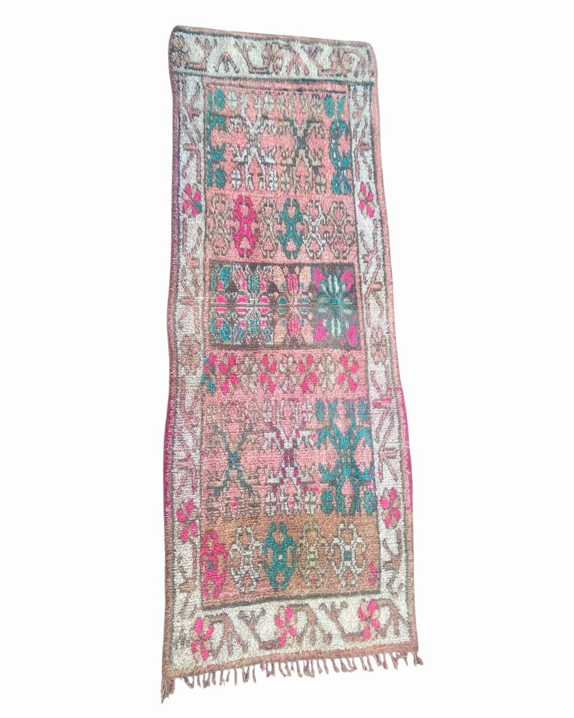 Unser Teppich besteht aus reiner Wolle und ist traditionell auf einer Seite mit Fransen versehen. Seine grosszügigen Masse betragen etwa 0.9m x 2.9m.